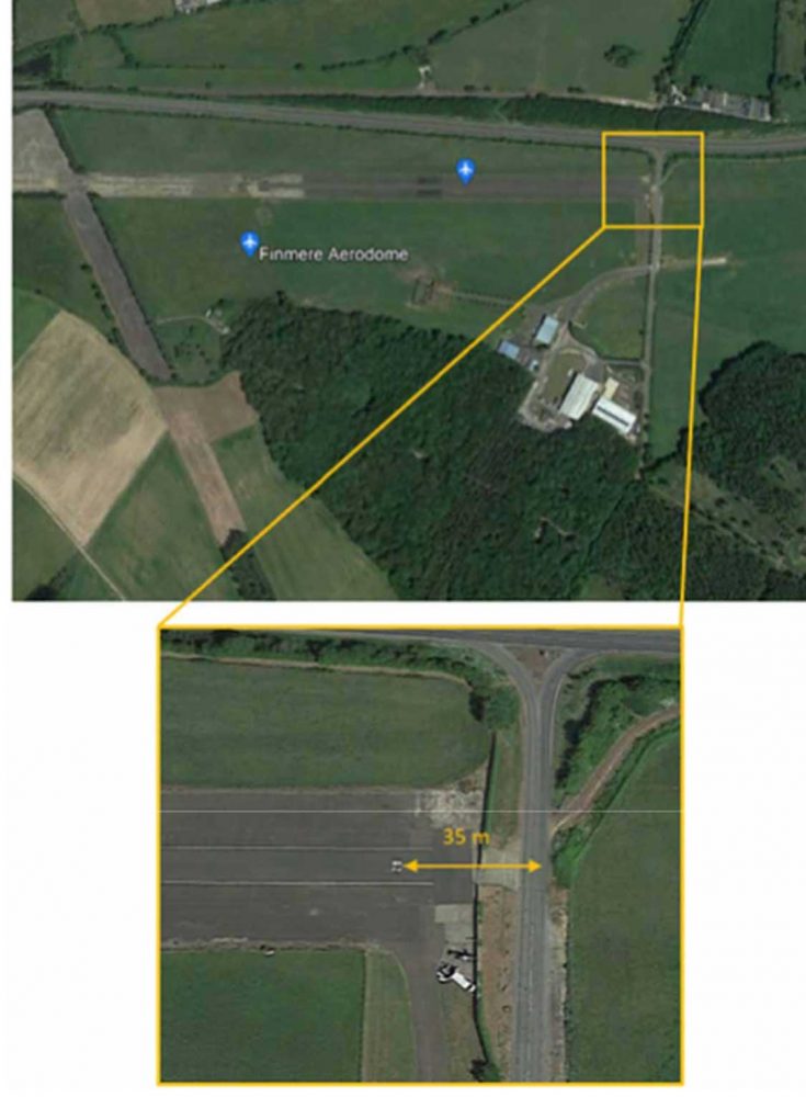 Finmere Aerodrome is an unlicenced aerodrome located 11 nm west of Milton Keynes. It has one asphalt runway, 10/28, which is 701m long. The end of Runway 28 is 35m from the road (Figure 1). Finmere requires pilots to request permission before visiting.